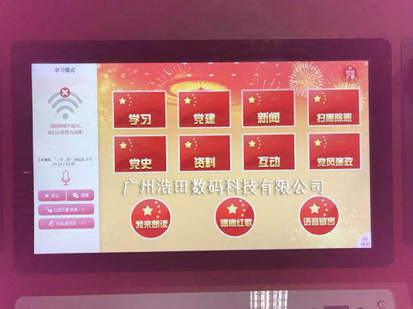 廣州浩田有限公司為機關(guān)單位訂購的紅色朗讀亭,并通過紅色學習朗讀亭以“紅愛國”“黨建”“掃黑除惡”“黨風廉政”為主題,將朗讀與紅色教育碰撞火花。紅色學習亭整體機身采用紅色,與黨和國家的主題相符合。內(nèi)容圍繞黨史/黨風廉政/新聞/學習等多方面進行。