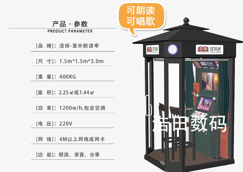朗讀亭伴隨著央視中央電視臺開年力作,大型文化情感節(jié)目《朗讀者》的籌劃應運而生、朗讀亭外觀古樸、比普通的電話亭要稍微略大一些,上面寫著大大的“朗讀亭”字樣,24小時開放。內(nèi)部工作臺、電源、燈飾、插座及一套完整的錄音設備。廣州浩田為客戶提供室外朗讀亭加盟渠道,為您解答朗讀亭價格費用、朗讀亭免費使用嗎、室外朗讀亭怎么使用等問題。