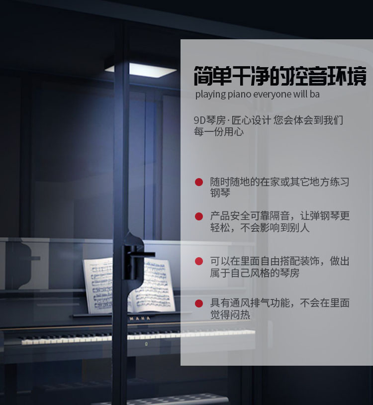 產品特點:可以通過App和小程序為用戶提供定位顯示,線上預約、掃碼開門、倉內燈光、空調、凈化器自動啟動,自動記錄分析用戶的練琴數據并輸出建議指導,用戶按使用時長自助結算,是一款很實用且便捷的自助智慧琴房,浩田自助琴房令充滿科技感.