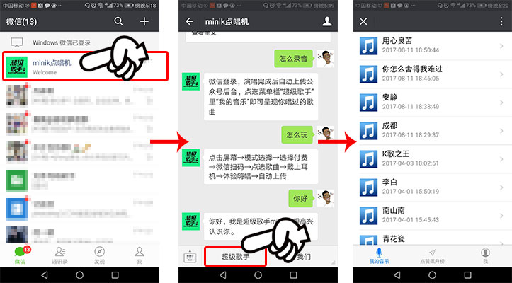 錄音結果路徑展示:(手機微信→超級歌手微信公眾號→下方欄超級歌手)中顯示,點開即可查看。