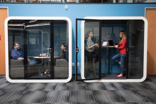 隱私倉(cāng)采用90%的冷軋鋼制造,整體外觀造型顯得很年輕、時(shí)尚,顏色也是可以隨意搭配不同主題的裝修風(fēng)格,建成后可隨時(shí)移動(dòng)至辦公空間的任何角落;而在隱私性保護(hù)方面,隱私倉(cāng)可對(duì)辦公場(chǎng)所中的各種聲音(包括電話、談話及咳嗽等)作出一定程度的隔離,而隱私倉(cāng)內(nèi)的聲音較難傳出艙外,以保證員工私密性需求。