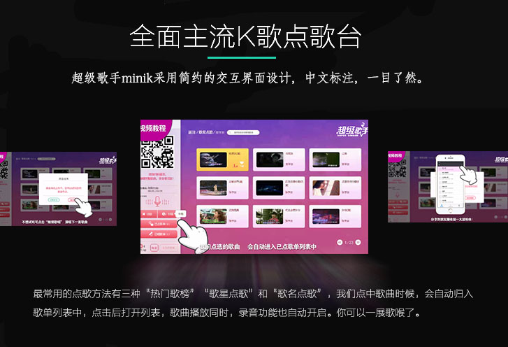 老少皆宜的觸屏式操作點(diǎn)歌界面、歌星、分類等點(diǎn)歌方式一觸即達(dá)帶來(lái)非凡的視覺(jué)易用體驗(yàn)。